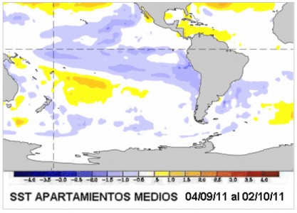 La última semana el Pacífico central ha promediado un enfriamiento de dos décimas de grado respecto de la condición neutral. De todos modos hay consenso en los analistas en cuanto a que la señal Niña presenta evidencias en los patrones de circulación atmosférica. Este no es un argumento para justificar la falta de lluvia que mostró septiembre y que oportunamente se está quebrando. Tampoco puede asegurarse que este evento no tendrá influencia en lo que resta del año, lo que sí es improbable es que su efecto sea igual al del año pasado. Si a las condiciones de