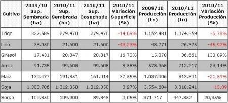 El siguiente cuadro compara los datos estadísticos finales de trigo, lino, girasol, arroz, soja, maíz y sorgo de las dos últimas campañas agrícolas en Entre Ríos.