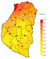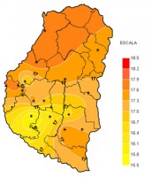 En los últimos siete días un centro de baja presión en superficie, combinado con el avance de un sistema frontal frío provocó importantes precipitaciones sobre la provincia, pero tuvo una influencia relativa sobre los regímenes de temperatura. Las máximas fueron las mas afectadas ya que disminuyeron desde los 31ºC registrados la semana anterior a valores que, solo en algunos casos, alcanzaron los 27ºC. Las mínimas por su parte casi no se vieron afectadas y se mantuvieron en torno de los 10ºC al igual que en el periodo previo. Esta amplitud térmica permitió una media diaria de aproximadamente 17ºC.
