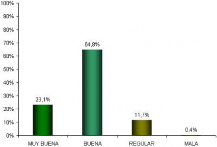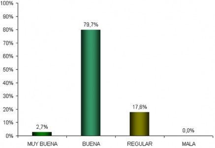 La encuesta realizada refleja que tan solo el 2,7% del área implantada exhibe un estado evaluado como “Muy Bueno”, el 79,7% de los lotes muestra una condición “Buena” y el 17,6% restante “Regular”. Ver Gráfico 2. Dentro de los principales inconvenientes se menciona el importante grado de enmalezamiento que presentan los lotes y el bajo stand de plantas.