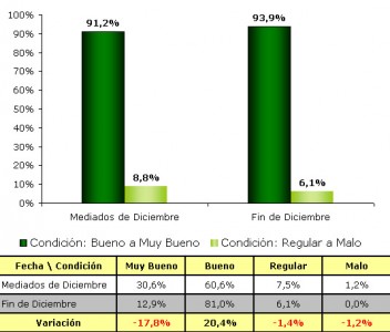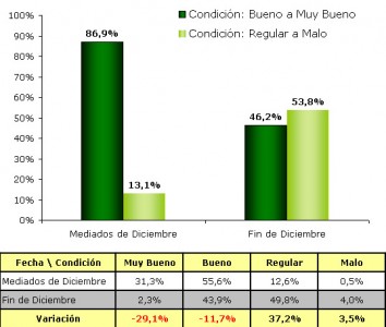 Desde mediados de diciembre al día de la fecha se detecta una caída del 17,8% en la condición muy buena, incrementándose la situación calificada como buena en un 20,4%; mientras que no se reportan lotes en una condición mala y una leve mejoría de los regulares, ver Gráfico 4.