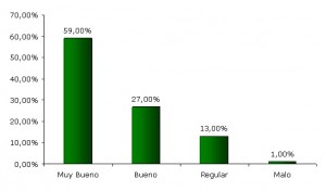 Realizada la consulta sobre el estado del cereal, los Colaboradores reportan que el 86% del área implantada con arroz se encuentra en condición de Bueno a Muy Bueno y solo el 14% de Regular a Malo (Ver gráfico)