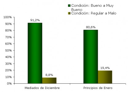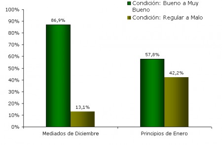 El sorgo por ser un cultivo más rústico ha sobrellevado mejor la falta de precipitaciones, aunque si bien el deterioro en el estado del cultivo no es tan importante como en el caso del maíz, también se ha visto afectado por las condiciones climáticas adversas. La comparación de la condición del cultivo desde mediados de diciembre al presente es la que se refleja en el Gráfico 3.