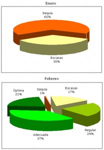 Para concluir este breve análisis de lo ocurrido en el mes de febrero se han realizado los Gráficos 2 y 3 que muestran las categorías imperantes en lo que a reservas hídricas se refiere para los meses de enero y febrero.