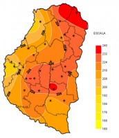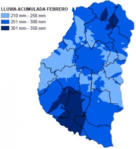 El Mapa 2 presenta la precipitación acumulada en el mes de febrero del 2012, como puede apreciarse los mínimos se posicionaron cercanos a los 210 mm y los máximos levemente por debajo de los 340 mm, situándose el valor promedio para la región en 270 mm.