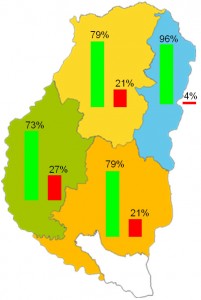 En el Mapa 1 se puede apreciar con mayor precisión la condición del cultivo de soja de 2da en las cuatro regiones en las que se ha dividido la pronvincia.