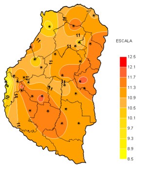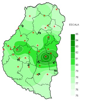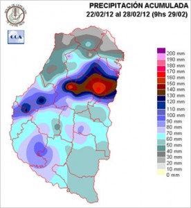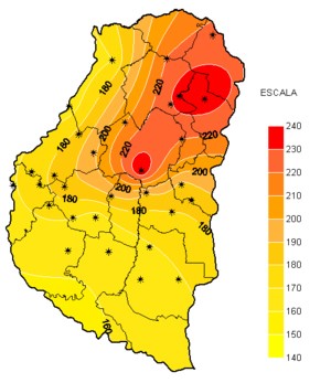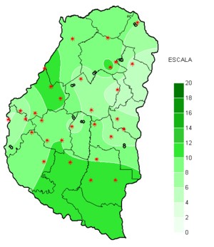 En el mapa que representa las precipitaciones de este evento, solo aparece un máximo destacado en el departamento Gualeguay, pero en general las lluvias se han desplegado en corredores homogéneos, sin que se produzca una gran dispersión en la oferta de agua. Esto se nota claramente en el mapa, con el oeste mejor provisto y acumulados que disminuyen en general hacia el noreste.