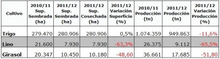 El siguiente cuadro compara los datos estadísticos finales de trigo, lino y girasol de las dos últimas campañas agrícolas en Entre Ríos.