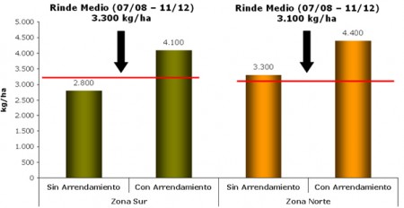 En la zona sur el rinde promedio de los últimos 5 años es de 3.300 kg/ha, por lo tanto el productor en campo propio debería obtener por lo menos 2.800 kg/ha para salvar los gastos (escenario factible); pero cuando se le suma el costo del arrendamiento, el que generalmente se pacta en quintales de soja, está obligado a lograr 4.100 kg/ha (escenario muy riesgoso).