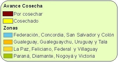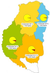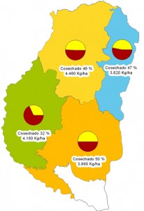 Cabe mencionar que de las cuatro zonas en que se ha dividido la provincia, el Sector Oeste y Sur son las más retrasadas debido a la ocurrencia de precipitaciones de mayores cuantías, situación opuesta se detecta en el Sector Este y Norte donde prácticamente se ha cosechado la totalidad de las hectáres.