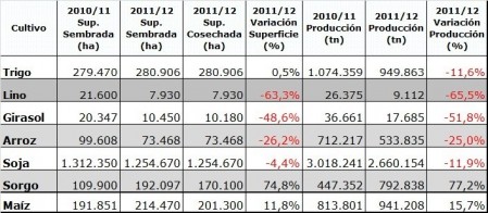 El siguiente cuadro compara los datos estadísticos finales de trigo, lino, girasol, arroz, soja, sorgo y maíz de las dos últimas campañas agrícolas en Entre Ríos.