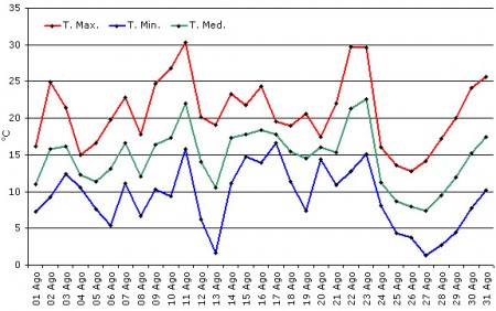 El valor medio de la máxima promedió 20,9 oC, superando en 1,5 oC el valor esperado que es de 19,3 oC. El sábado 11, miércoles 22 y jueves 23 de agosto resultaron los días más cálidos con temperaturas máximas muy próximas a los 30 oC.
