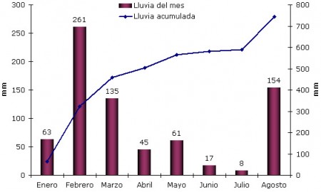 Habiéndo finalizado el mes de agosto el promedio de las precipitaciones acumuladas en lo que va del 2012 es de 744 mm y se posiciona muy próximo a los 756 mm que es el acumulado esperado a esta altura del año.