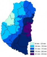 La precipitación acumulada promedio en el territorio entrerriano superó holgadamente a lo histórico o esperado que se aproxima a los 55 mm; esto claramente se ve reflejado en el Mapa 1 donde los mínimos estuvieron por encima de los 90 mm y los máximos cercanos a los 250 mm, siendo la media geográfica de 161 mm.