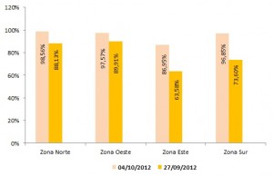 Analizando por zonas, las de riego por ríos y represas contabilizan alrededor del 30 %  de avance en contraste con la de riego por pozo, que esta 20 puntos por debajo, las causas principales de este atraso son los inconvenientes de piso ya que en los lotes taipeados se encuentran sectores con excesos hídricos que no permiten dicha labor.