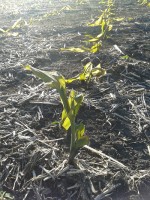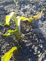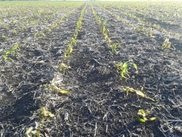 En el maíz se observó necrosis en los tejidos, pero el ápice de crecimiento sigue con vitalidad, por lo cual se estima que estos lotes no deberán ser resembrados, pero si implica una diferencia temporal en el lote, ya que algunos sectores han sido más afectados como por ejemplo los bajos o las zonas con mayor cantidad de rastrojos. En las últimas siembras realizadas no se detectó afectación debido a que aún no se ha producido la emergencia de las plántulas.