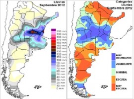 La comparación de las precipitaciones observadas en septiembre con respecto a los valores estadísticos (1973-2011), define el mapa de categorías de lluvia. Al igual que en agosto, se repite un extendida anomalía positiva de las precipitaciones, pero en este caso restringida a la franja central. Se observa como el marcado retroceso pluvial en el norte se traduce en un apartamiento negativo generalizado en la zona, que también se aprecia sobre el sur de LP y que marginalmente afectó los partidos costeros del sur de BA.