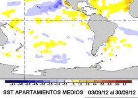 Por otra parte, es interesante notar que respecto del mes anterior, se ha fortalecido el calentamiento frente a las costas de Brasil, observándose también una ganancia en la organización areal de esta anomalía. Es decir, el patrón cálido del Atlántico se está intensificando y volviendo más homogéneo. Para Uruguay, sur de Brasil, el centro sur de la Mesopotamia, SF y noreste de BA, en general esa anomalía tiende a favorecer el crecimiento de la oferta de agua, perdiendo eficiencia como indicador para el resto de la región pampeana. Eventualmente un repunte del evento El Niño podría sumarse a este calentamiento del Atlántico y fortalecer la posibilidad de que se concreten lluvias por encima de los valores normales en este último trimestre del año. Entre estos dos elementos se estará definiendo la oferta de agua para lo que resta de 2012. Si el fenómeno de El Niño no repunta, las lluvias más generosas podrían recostarse con mayor probabilidad en zonas agrícolas del este.