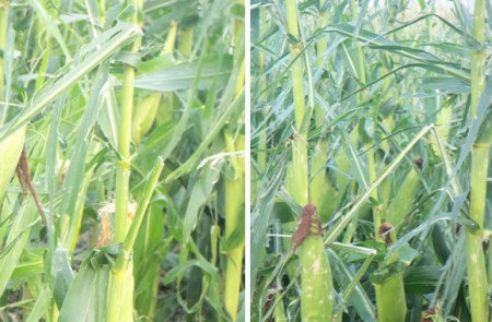 En lotes de maíz, entre V8 y R4, la incidencia de la roya común es alta, pero con severidades muy bajas en los deptos. Nogoyá, Diamante y Victoria. El tizón foliar común fue hallado con severidad alta en un lote de Victoria, sin embargo ataques muy severos y ya por fuera del umbral de acción se evaluaron en los Dptos La Paz, Feliciano y Concordia.