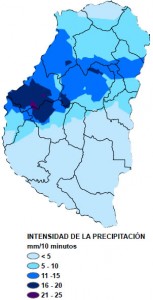 En base a los datos que brina la Red de Centrales Meteorológicas Automáticas de la Bolsa de Cereales de Entre Ríos se ha elaborado el Mapa 3 que refleja en qué sector y cuál ha sido la máxima intensidad de precipitación durante la tormenta del pasado domingo 16 de diciembre. Tal como explica la leyenda, los valores de intensidad de lluvia están expresados en milímetros cada 10 minutos.