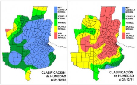Al comparar la clasificación de humedad para la misma fecha de diciembre, el resultado que se obtiene es de una notable diferencia. El Mapa 1 de lluvias descripto permite justificar el resultado de la clasificación actual de humedad (Mapa 2) destacándose que los corrimientos positivos de las reservas se dan en zonas donde las lluvias han tenido un comportamiento normal o con sobreofertas mucho más modestas que las observadas en el centro este de la región pampeana. Presentamos el mapa actual conjuntamente con el de la misma fecha del año pasado, para potenciar el efecto del marcado contraste de situaciones hídricas.
