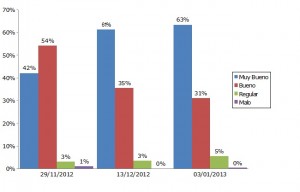 El gráfico Nº 1 compara la condición del maíz antes, durante y después de la floración, como se puede apreciar desde fines de noviembre hasta el día de la fecha alrededor del 95% de los lotes presentan condición de Muy Buena a Buena manteniéndose estable la condición de Regular, en un ínfimo porcentaje que oscila entre 3% y 5%, esta situación se condice con el año climáticamente favorable para el cereal que por las oportunas precipitaciones que acompañaron el desarrollo del cultivo.