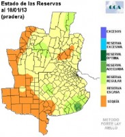 Partiendo de las condiciones actuales de humedad y teniendo en cuenta una semana sin precipitaciones como es consensuado por la mayoría de los modelos, podemos simular cual es el estado de reservas para una pradera. No debe tenerse en cuenta el resultado para aquellas zonas que han permanecido anegadas.