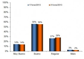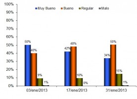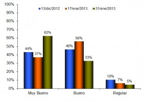 En el Gráfico 1 se puede apreciar como particularmente la condición muy buena ha ido gradualmente decreciendo desde un valor del 50% en los primeros días de enero hasta 34% al finalizar el mes. Otro punto a destacar es el alza de la condición regular que se incrementó de 9% a 15% en el mismo período.