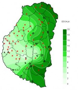 Al igual que la semana previa algunas precipitaciones dispersas estuvieron presentes, esta vez con un mayor acumulado sobre las localidades del sector noroeste de la provincia como Hernandarias y San Gustavo. Las mismas, acompañadas del ingreso de aire un poco más fresco, sirvieron para moderar un poco las muy altas temperaturas registradas en los últimos siete días. La Tasa de Radiación solar media registrada fue muy alta, por encima de los 1300 W/m2 en el cenit, aunque normal para la época. La humedad relativa se mantuvo moderada en torno al 60% de promedio y por su parte las Horas de Mojado foliar una vez más no registraron valores acumulados significativos, más allá de la coincidencia con las horas en que se registraron precipitaciones.