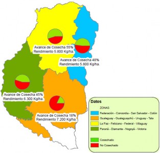 Por otra parte, es relevante destacar que el sector sur (que abarca el 36% del área total de maíz de 1era) cuenta actualmente con el menor porcentaje de cosecha pero posee mejores rendimientos promedios; por lo tanto es factible que en la medida que avancen las labores de trilla en este sector, el rinde promedio provincial se vea incrementado (ver Mapa 1 el avance por zonas).