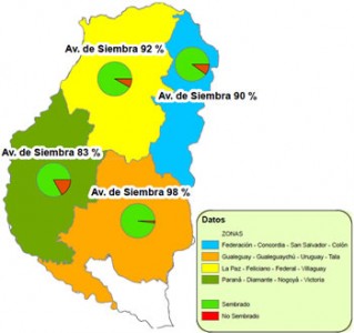 En base a la información recibida de la Red de Colaboradores se determinó un avance en las labores de siembra cercano al 30%, manteniéndose por el momento una intención de siembra similar a la registrada en la campaña 2012/13 que fue de 68.400 ha; este porcentaje indica que en la geografía entrerriana se han implantado alrededor de 20.000 ha.