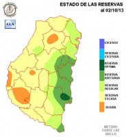 El diferencial de precipitaciones entre el este y el oeste se traduce en el estado de las reservas. Claramente las mismas se ajustan sobre el oeste, apareciendo algunos sectores que ya caen en niveles de sequía. Los mismos no deben considerarse sobre zonas del delta, donde aparecen por una cuestión de mapeo, sin embargo expresan el mal paso que pueden estar llevando los cultivares de trigo transitando su período de floración.