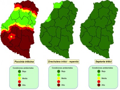 Las variables climáticas, en general se mantuvieron en valores cercanos y dentro del rango conductivo para roya de la hoja del trigo (específicamente en temperatura y horas de mojado foliar). Sólo en algunos casos, los valores de temperatura y horas de mojado foliar para mancha amarilla, se acercaron al rango mínimo, sin llegar a alerta «rojo» en ninguna estación meteorológica. Para septoriosis de la hoja, el alerta es verde generalizado, pues las condiciones conductivas se alejan marcadamente del rango óptimo de infección.