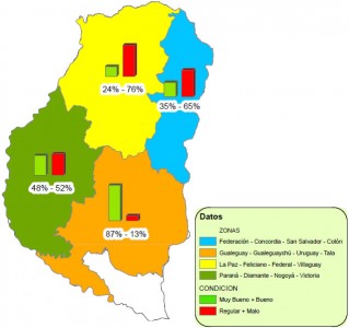 Por un lado una caída del porcentaje de lotes calificados como muy buenos (expectativas de rindes por encima de los valores medios), que hacia inicios de agosto abarcaba el 42% y actualmente tan solo engloban el 9%; situación que se verificó también en la condición buena (expectativas de rindes similares a los valores medios), la cual se redujo de 56% a 52%.
