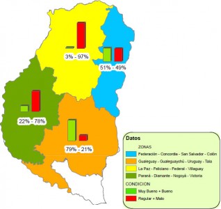 A nivel provincial alrededor del 7% del área implantada cuenta con una condición determinada como muy buena, el 88% posee una condición buena y tan solo el 5% ha sido designada dentro de la categoría regular. En el Mapa 9 se muestra la condición del cultivo por zonas.