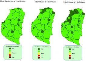 La situación hasta el 7 de octubre (con 3 alertas durante el período del 1 al 7 de octubre) tuvieron humedad relativa que no llegó al umbral mínimo, temperaturas por debajo del rango óptimo y baja ocurrencia de precipitaciones de escasa duración de mojado.