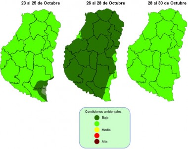 Las condiciones de temperatura estuvieron dentro del rango óptimo en el 70% de los días, sin condiciones de mojado. Solo las precipitaciones generaron las horas necesarias para provocar «alerta rojo» en el 40% de las estaciones.