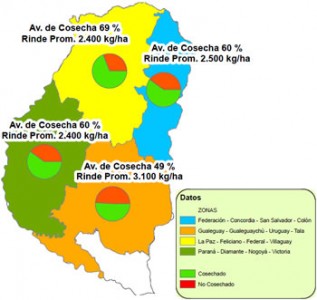 Los agricultores entrerrianos se encuentran en plena zafra, estimándose un progreso en las labores de cosecha cercano al 55% del área implantada (270.900 ha), lo cual equivale a una superficie trillada de 149.000 ha.