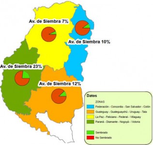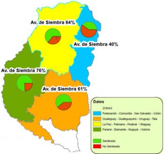 En la geografía entrerriana se ha concretado un avance del 65% de la intención de siembra, registrándose un progreso en las labores de 15 puntos porcentuales en el transcurso de la última semana, proyectándose que el área implantada se aproximaría a 754.000 ha.