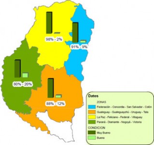 Actualmente el 100% del área cultivada con el cereal posee una condición que ha sido calificada entre buena y muy buena, el Mapa 4 presenta el porcentaje de lotes evaluados como buenos o muy buenos en las cuatro zonas en que ha sido dividida la provincia.