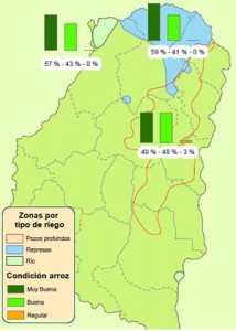 El análisis efectuado sobre la condición del cultivo de arroz indica que del área total implantada, 98% posee una condición que fuera calificada por los Colaboradores que trabajan en el sector como buena a muy buena, existiendo solamente un remanente del 2% que cuenta con un estado regular.