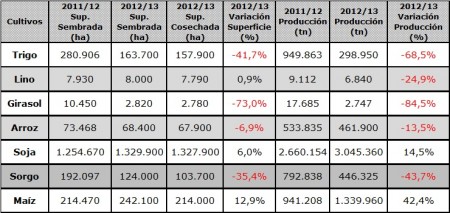 El siguiente cuadro compara los datos estadísticos finales de trigo, lino, girasol, arroz, soja, sorgo y maíz de las dos últimas campañas agrícolas en Entre Ríos.