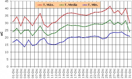 Lamentablemente el último mes del año 2013 no tuvo el comportamiento esperado, ya que a partir de la segunda quincena las marcas térmicas experimentaron un gradual crecimiento, superando las máximas los 35º C (salvo el descenso detectado el martes 31); produciéndose un pico máximo que superó los 40º C el jueves 26.