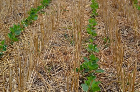 La soja de segunda, sembrada a mediados de diciembre de 2013, se halla en excelente estado sanitario y no supera los estados V1-V2 (Fotografía 6).