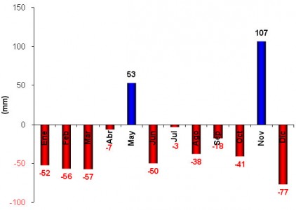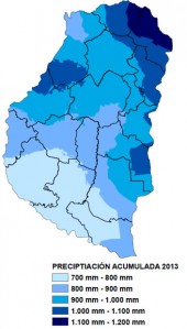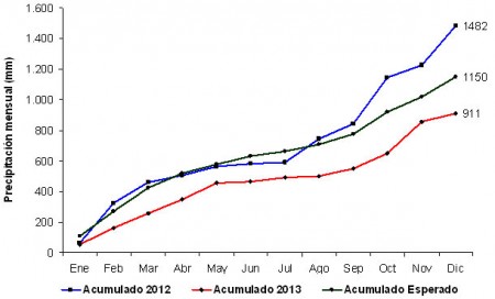 Comparando los montos finales, el año 2013 tuvo un déficit de aproximadamente 240 mm, lo cual representa una disminución que ronda el 20% del valor normal para la región.