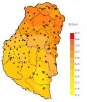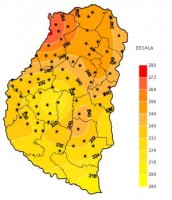 Los últimos siete días han marcado una diferencia sustancial de las marcas térmicas respecto del periodo previo ya que el ingreso de una masa de aire muy frío desde el sur del territorio nacional provocó un importante descenso de las mismas. El efecto más notorio se produjo en las marcas mínimas, que prácticamente se redujeron a la mitad de los valores registrados con anterioridad. Si bien similar efecto se produjo en las temperaturas máximas, el mismo no se ve claramente reflejado en el mapa correspondiente ya que durante los dos primeros días de la semana considerada, previos al ingreso del frente, las marcas máximas alcanzaron su valor mas alto, para luego disminuir abruptamente con el correr de los días, pero quedando dentro de este periodo de análisis.