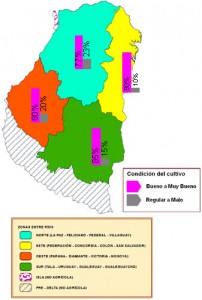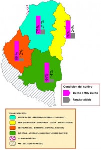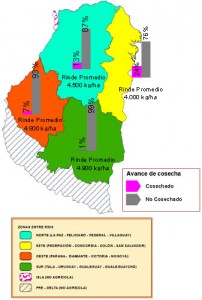 Puntualmente en el departamento Federación se cosechó el primer lote sembrado hacia fines de setiembre, correspondiente a un Grupo de Madurez V corto. El rendimiento promedio logrado en el mismo fue de 1.700 kg/ha, cabe aclarar que durante el período crítico el cultivo fue afectado por las altas temperaturas y el déficit hídrico del mes de diciembre.