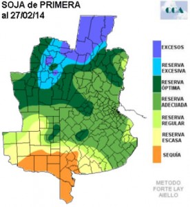 Una situación antagónica se detecta para el cultivo de soja de primera. Hacia fines del mes de enero, cuando el cultivo iniciaba su período crítico existía aproximadamente un 50% de la región con déficit hídrico; posteriormente el retorno de las lluvias (con montos más que significativos) revierte este escenario hasta llegar a mediados de febrero donde el 50% del área provincial contaba con excesos hídricos y el resto con buena disponibilidad hídrica.