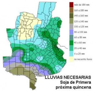 Dentro de las áreas principales el cultivo no presenta una demanda de precipitaciones de importancia, incluso casi toda la provincia de CB y el sur de SF podrían sostener reservas adecuadas de humedad con lluvias modestas o incluso sin precipitaciones.