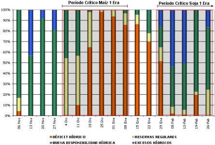 Al comenzar el mes de diciembre (donde se concentra el período crítico para el maíz de 1era) las lluvias menguaron gradualmente, asociado a este hecho la ola de calor generó que las reservas hídricas se fueran agotando gradualmente; situándonos al 25 de diciembre con alrededor del 95% del área con una situación de déficit hídrico. Este hecho impactó negativamente en el potencial de rinde del cereal que hacia fines de noviembre era muy alentador.